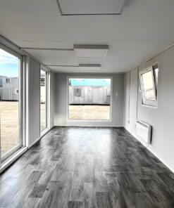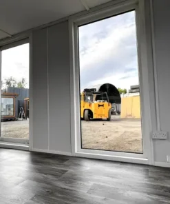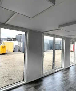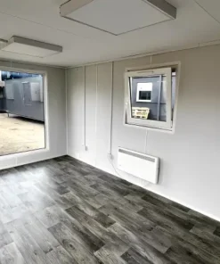 Featuring vinyl flooring, heating, LED lighting, multiple PVC double-glazed windows, and sliding glass doors, this portable building offers a bright, modern environment perfect for business or site operations.